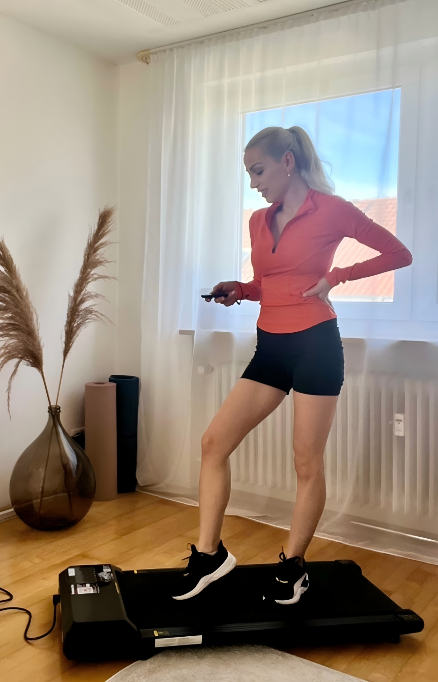 Sí, la cinta de correr Q1 Urban cuenta con una práctica función que ahorra espacio. Se guarda fácilmente debajo de un sofá, una mesa o una cama, y también se puede montar verticalmente contra la pared.