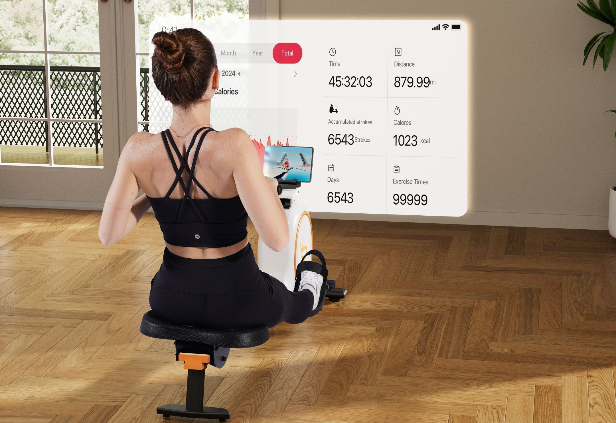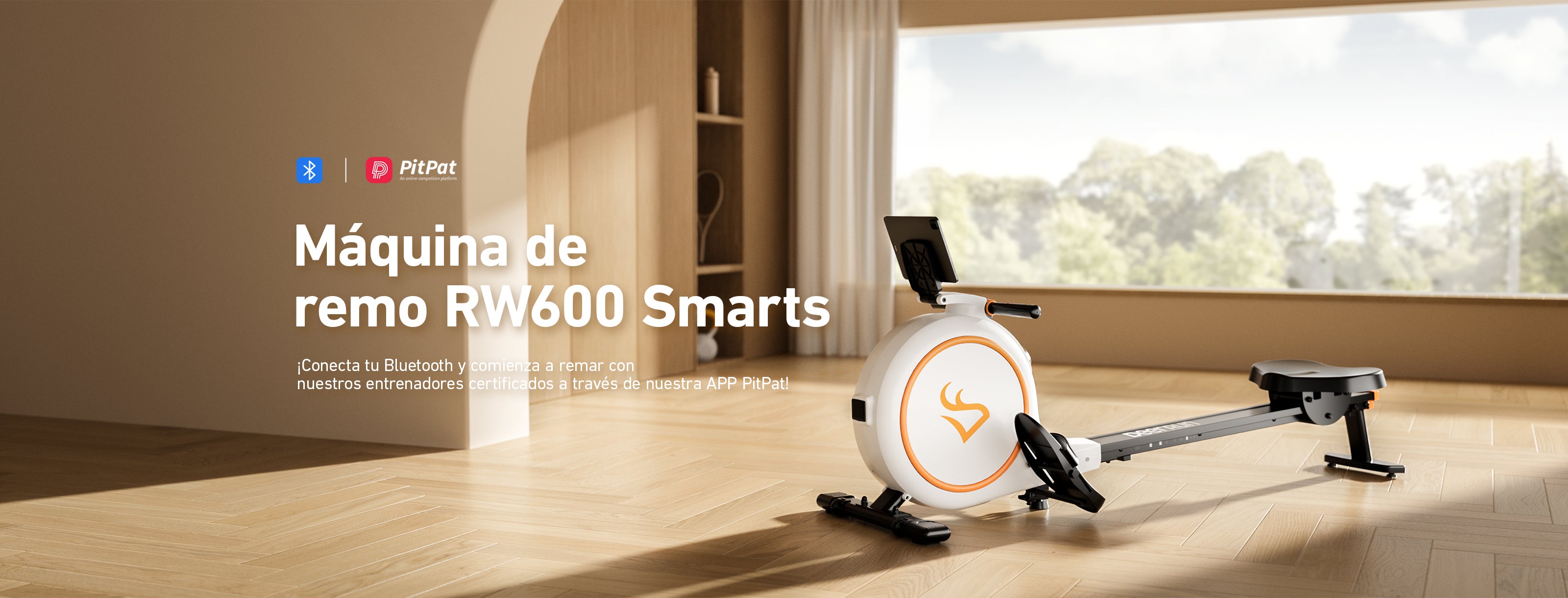 RW600 Remero inteligente: Entrenamiento completo de cuerpo de bajo impacto. Conéctate por Bluetooth con nuestra app PitPat y rema con instructores certificados para un entrenamiento completo del cuerpo suave. Puedes disfrutar de un funcionamiento estable y silencioso con 32 niveles de resistencia ajustables, monitoreando tu progreso en la pantalla LED. ¡Chatea en línea con amigos y vive el remo como en la naturaleza desde tu sala de estar!